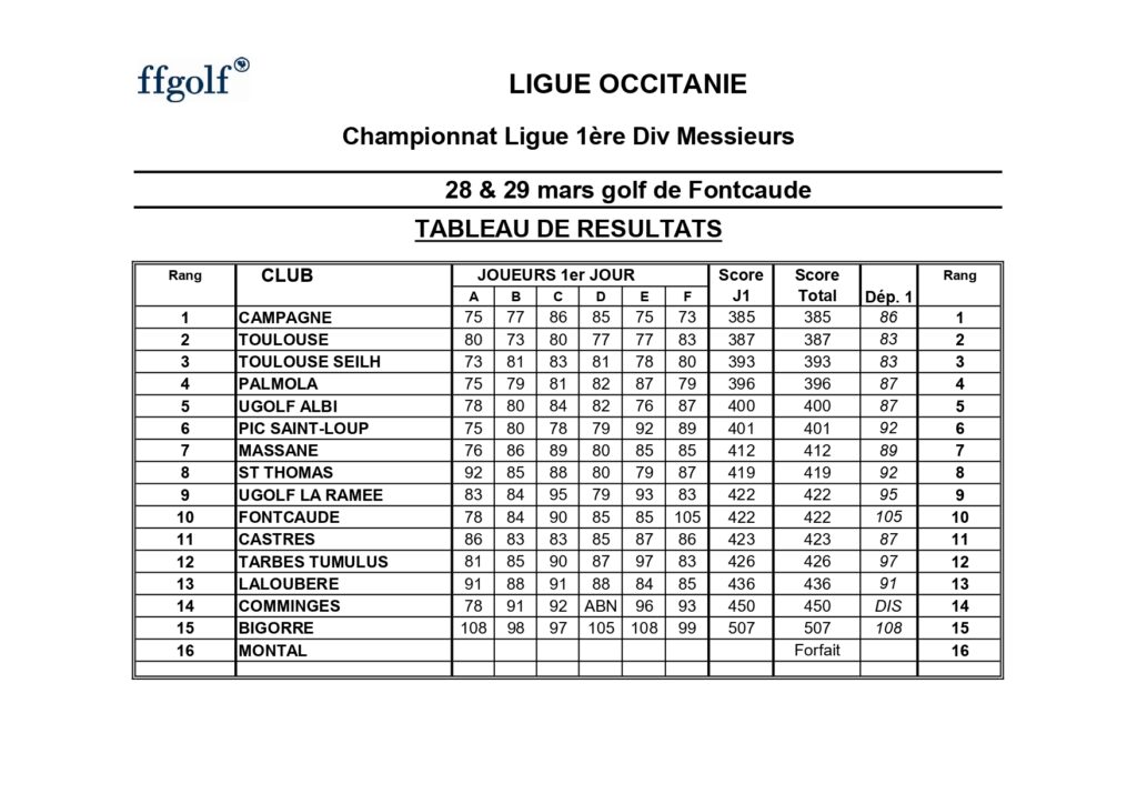 Week-end golfique compliqué pour toutes les équipes du championnat de ligue 1ère division messieurs à Montpellier. En effet, en plus du parcours difficile de Fontcaude, un vent fort et le froid étaient au programme.